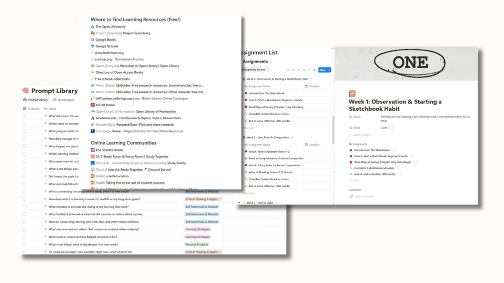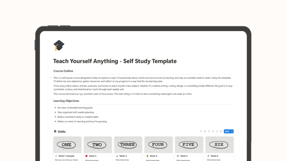Turn your curiosity into structure with this powerful, easy-to-use Notion template for self-paced learning. Whether you’re learning a language, mastering design, exploring philosophy, or prepping for a new career, this DIY course builder helps you create a clear, motivating path through any topic.